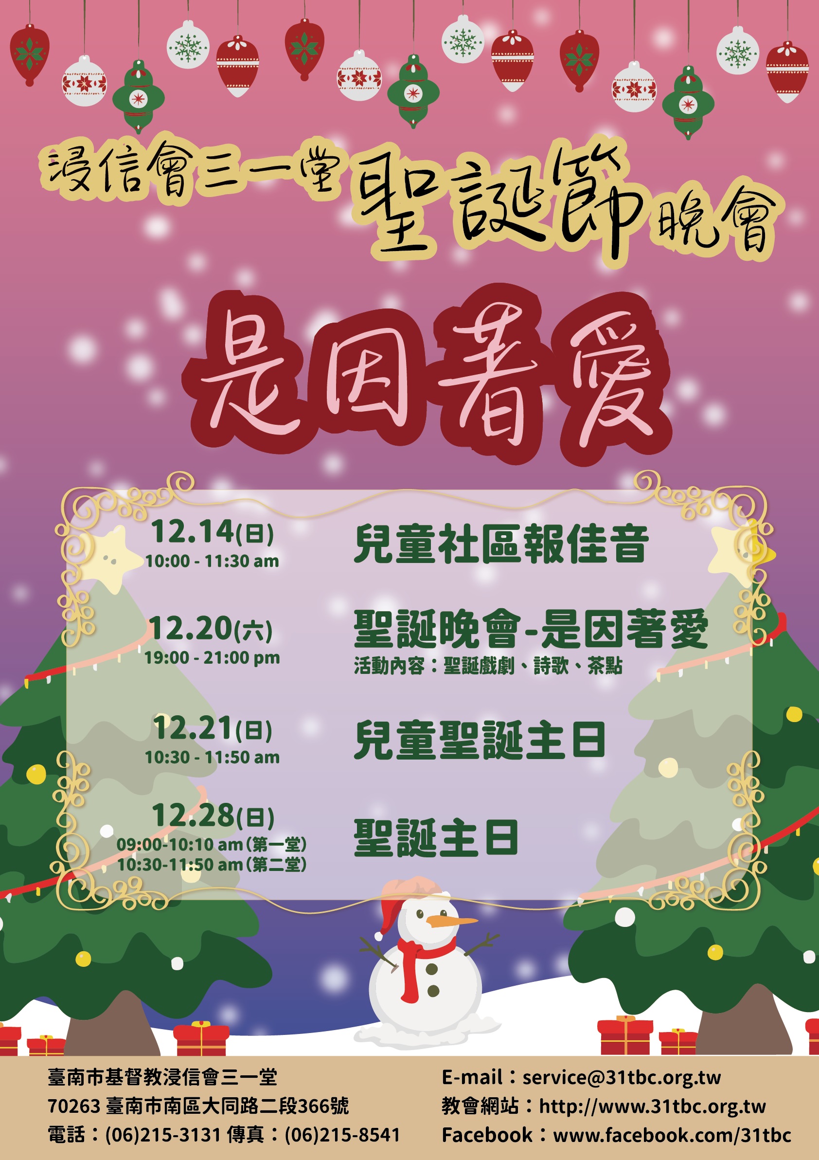 2025聖誕節晚會12月14日(日)上午10:00-11:30 兒童社區報佳音 12月20日(六)晚上19:00-21:00 聖誕晚會 12月21日(日)晚上10:30-11:50 兒童聖誕主日12月28日(日)上午09:00-10:10(第一堂)上午10:30-11:50(第二堂) 聖誕主日歡迎弟兄姊妹邀請親友鄰舍參加。